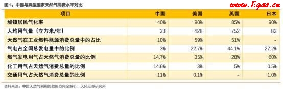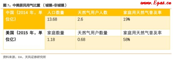 居民天然氣消費(fèi)擁有很大的潛力,因?yàn)槟壳爸挥行〔糠殖鞘芯用窨墒褂锰烊粴?。根?jù)國家統(tǒng)計(jì)局?jǐn)?shù)據(jù),中國不到20%的人口可使用管道天然氣,而美國的這一數(shù)字達(dá)58%。隨著可支配收入和生活水平的提高,越來越多的居民出于便利性和清潔性而傾向于使用管道天然氣。