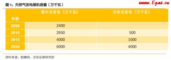 據(jù)中電聯(lián)的《"十三五"天然氣發(fā)電需求預(yù)測》,預(yù)計(jì)2020年我國天然氣發(fā)電規(guī)模1億千瓦,其中分布式4000萬千瓦。當(dāng)前我國天然氣分布式能源總裝機(jī)容量為500萬千瓦,缺口很大。假設(shè)9F聯(lián)合循環(huán)機(jī)組設(shè)備購置加安裝的平均費(fèi)用為2500元每千瓦,到2020年,集中式天然氣發(fā)電新增市場規(guī)模將達(dá)500億元。假設(shè)天然氣分布式發(fā)電設(shè)備購置及安裝費(fèi)用為3500元每千瓦,到2020年,分布式天然氣發(fā)電設(shè)備新增市場規(guī)模將超過1000億元。