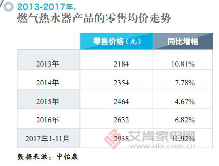 國內(nèi)外品牌紛紛加碼高端市場的新攻勢(shì),直接帶動(dòng)了燃?xì)鉄崴鳟a(chǎn)品整體均價(jià)的大幅上揚(yáng)。據(jù)中怡康數(shù)據(jù)顯示,2017年1-11月份,燃?xì)鉄崴鞯牧闶劬鶅r(jià)上漲了11.92個(gè)百分點(diǎn)至2938元。盡管考慮到中怡康的監(jiān)測(cè)樣本以連鎖賣場為主,價(jià)格系數(shù)會(huì)相應(yīng)偏高,但如此大的漲幅印證了燃?xì)鉄崴髡诩铀佼a(chǎn)品結(jié)構(gòu)的調(diào)整和升級(jí)。據(jù)《艾肯家電》統(tǒng)計(jì),2017年,我國燃?xì)鉄崴鳟a(chǎn)品的整體均價(jià)大致維持在2055元左右,同比漲幅約6.15%。