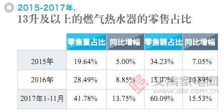 高價(jià)格需要產(chǎn)品技術(shù)上的硬支撐。2017年,無論線上還是線下,大出水量的燃?xì)鉄崴鳟a(chǎn)品都更加暢銷,其中13L以上(含13L)產(chǎn)品的銷量占比均超過了50%。在燃?xì)鉄崴鞯?ldquo;安全”問題得到解決、“恒溫”成為產(chǎn)品標(biāo)配后,“大升數(shù)”已經(jīng)開始主導(dǎo)市場,體現(xiàn)了用戶對(duì)洗浴舒適度的更高追求。同時(shí),四季感溫、自動(dòng)變升、斷電記憶、防凍自啟、智控風(fēng)壓、水氣雙閥、語音播報(bào)等更多智能功能的應(yīng)用,也在極大程度上改善了用戶體驗(yàn)。
