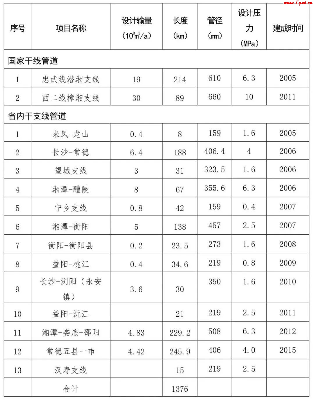 表1:湖南省內已建成主要天然氣管網情況表