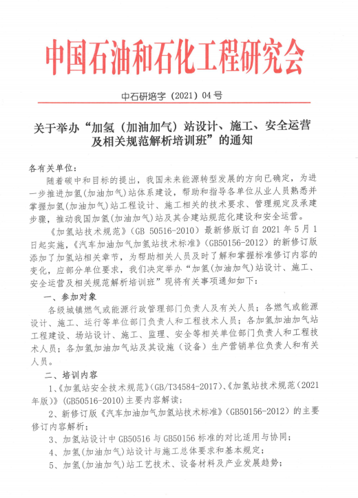 關(guān)于舉辦“加氫(加油加氣)站設(shè)計、施工、安全運營及相關(guān)規(guī)范解析培訓(xùn)班 ”的通知