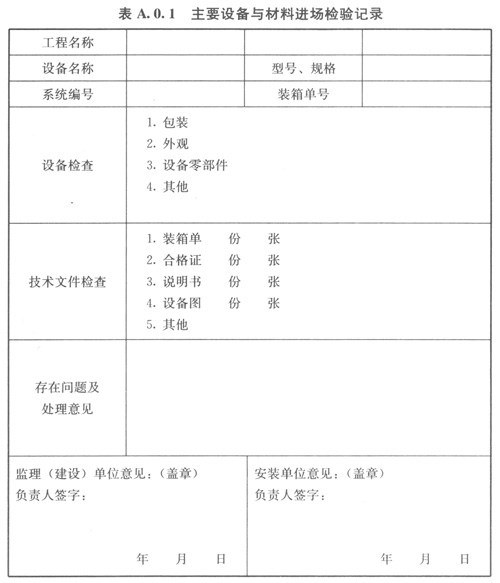 A.0.1主要設備與材料進場檢驗記錄可按表A.0.1的格式記錄。