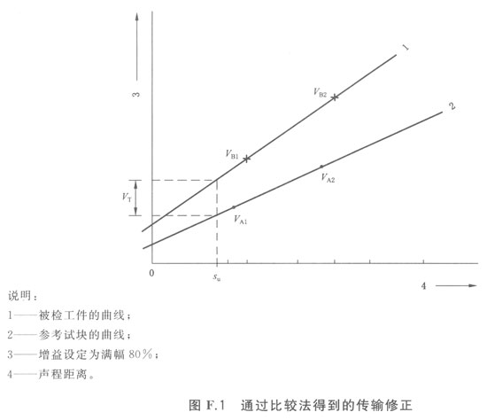 將探頭置于參考試塊上,分別將第一次和第二次底波調(diào)整至示波屏的同一高度,并記下相應(yīng)的增益值(VA1,VA2見圖F.1)。依據(jù)增益值與聲程距離的關(guān)系繪制出圖G.1中的線2。然后將探頭重新置于工件上,重復(fù)上述步驟得到(VB1,VB2和圖F.1中的線1)。對應(yīng)適當(dāng)?shù)穆暢?span style=";padding: 0px">(su),通過兩線得出增益差值,即傳輸修正(DVt),見圖F.1。