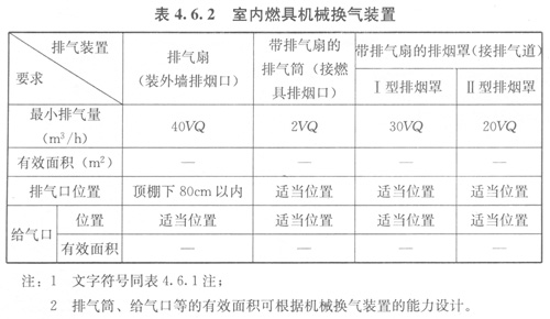 4.6.2室內(nèi)燃具機械換氣裝置應(yīng)符合表4.6.2的規(guī)定。