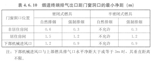 4.6.10穿外墻的煙道終端排氣出口距門窗洞口的最小凈距應(yīng)符合表4.6.10的規(guī)定。距地面的垂直凈距不得小于0.3m。煙道終端排氣出口應(yīng)設(shè)置在煙氣容易擴散的部位。