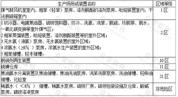 表B-2煤氣凈化車間主要生產(chǎn)場所爆炸及火災(zāi)危險區(qū)域等級