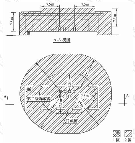 1 以釋放源為中心,按本附錄第E.0.2條規(guī)定的范圍內(nèi)劃分為2區(qū);