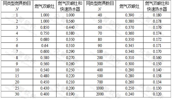 2 表中“燃?xì)怆p眼灶和快速熱水器”是指一戶居民裝設(shè)一個(gè)雙眼灶和一個(gè)快速熱水器的同時(shí)工作系數(shù)。