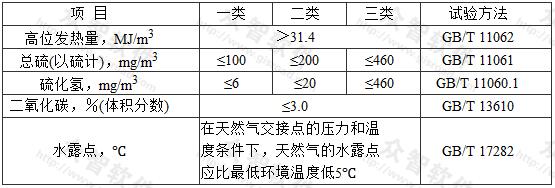 1)天然氣發(fā)熱量、總硫和硫化氫含量、水露點(diǎn)指標(biāo)應(yīng)符合現(xiàn)行國(guó)家標(biāo)準(zhǔn)《天然氣》GB17820的一類氣或二類氣的規(guī)定;