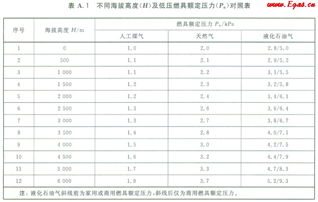 A1給出了不同海拔高度(H)及低壓燃具額定壓力(Pn)的對(duì)照表。