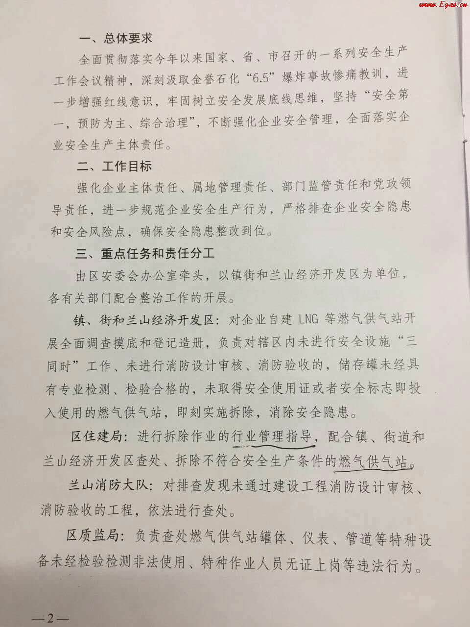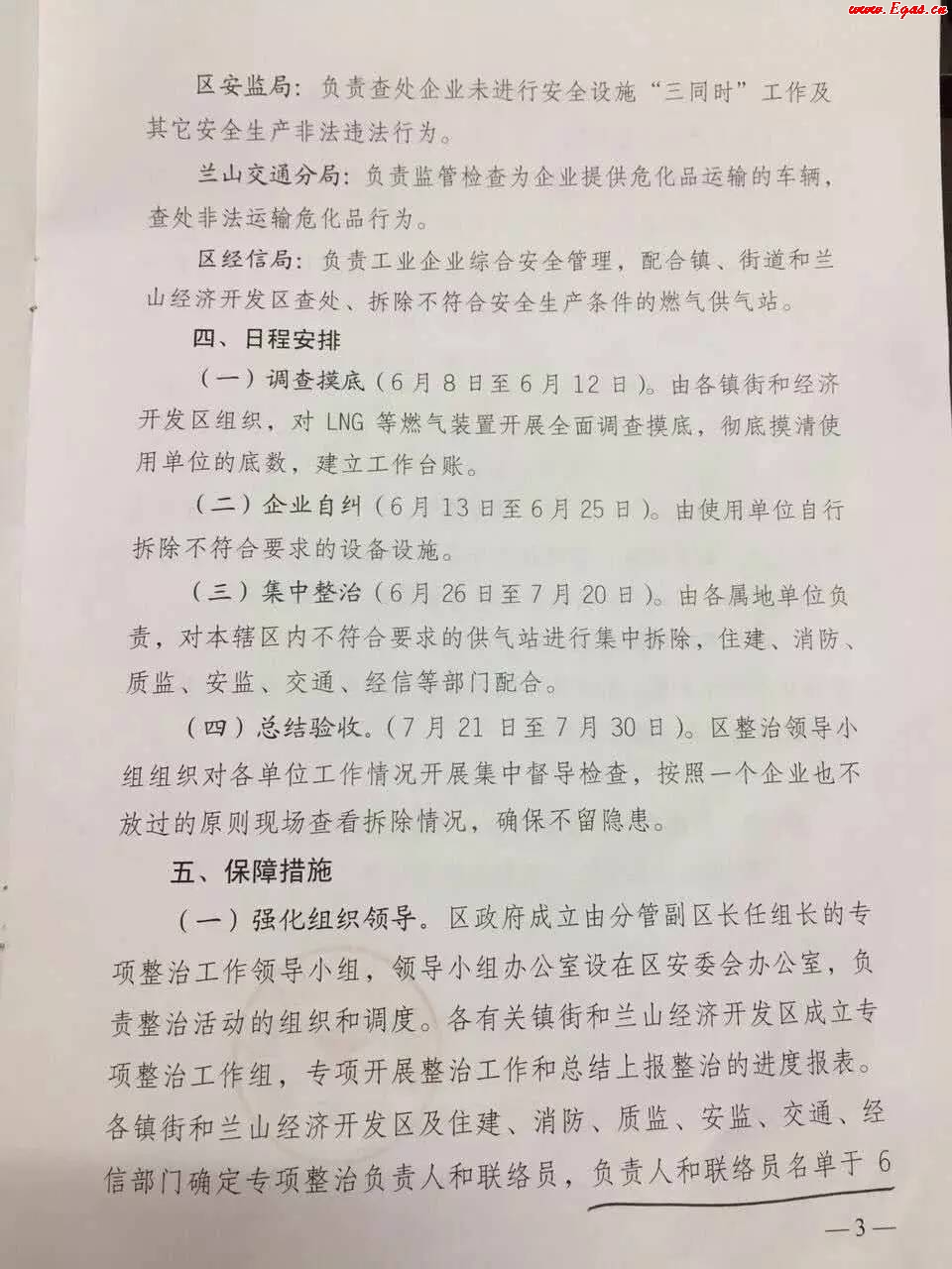 臨沂市蘭山區(qū)人民政府下發(fā)了關(guān)于開(kāi)展企業(yè)自用LNG設(shè)備等燃?xì)獍踩珜?zhuān)項(xiàng)整治行動(dòng)的通知。通知明確了鎮(zhèn)、街和蘭山經(jīng)濟(jì)開(kāi)發(fā)區(qū)、區(qū)住建局、蘭山消防大隊(duì)、區(qū)質(zhì)監(jiān)局、區(qū)安監(jiān)局、蘭山交通分局以及區(qū)經(jīng)信局等各部門(mén)的主要任務(wù)和責(zé)任分工,其中區(qū)住建局進(jìn)行拆除作業(yè)的行業(yè)管理指導(dǎo),而鎮(zhèn)、街道和蘭山經(jīng)濟(jì)開(kāi)發(fā)區(qū)具體執(zhí)行拆除作業(yè)。此外,通知還明確了專(zhuān)項(xiàng)整治行動(dòng)的各個(gè)時(shí)間節(jié)點(diǎn),企業(yè)自行拆除和各屬地單位集中拆除的時(shí)間節(jié)點(diǎn)需要注意。