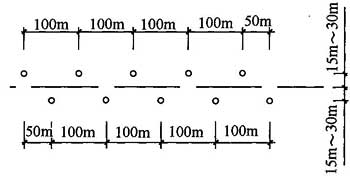 1 勘探孔應(yīng)沿穿越管線的軸線兩側(cè)錯開布置,孔距不宜大于100m,每排孔與穿越管線軸線的距離應(yīng)為15m~30m(圖4.3.5),