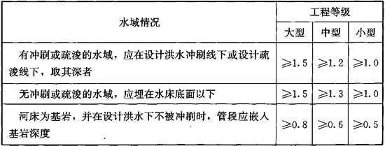 4.2.3 穿越水域的燃?xì)夤艿赖淖钚「餐梁穸?,?yīng)根據(jù)工程等級與相應(yīng)設(shè)計洪水沖刷深度或疏浚深度要求確定,并符合下列規(guī)定: