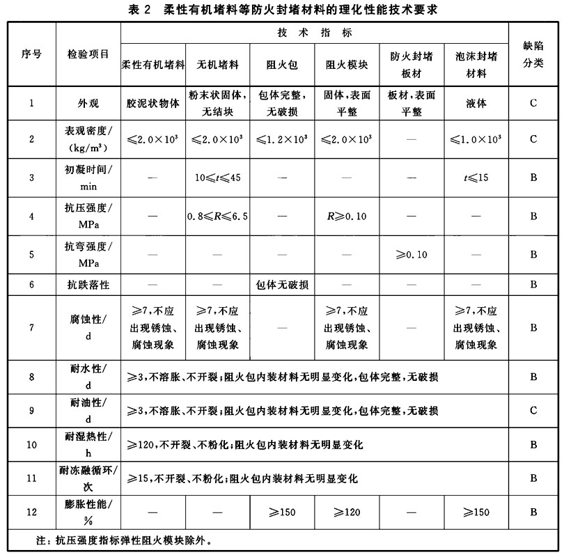5.3.1 柔性有機(jī)堵料、無機(jī)堵料、阻火包、阻火模塊、防火封堵板材和泡沫封堵材料的理化性能應(yīng)符合表2的規(guī)定。