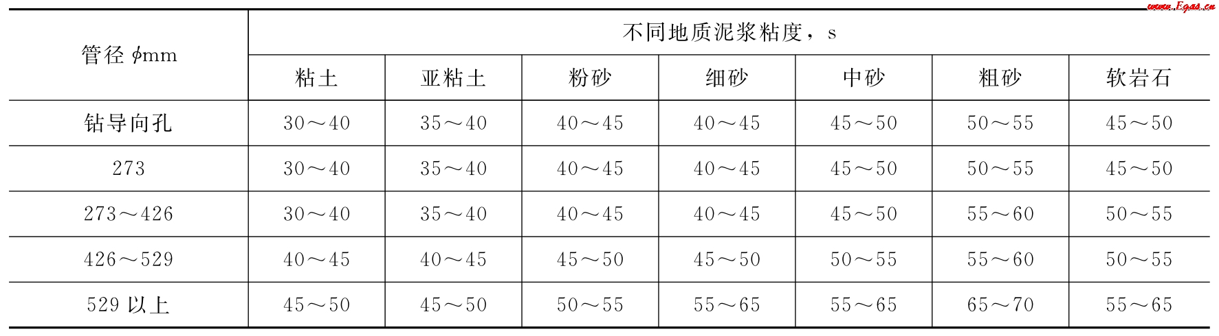 泥漿粘度應(yīng)根據(jù)地質(zhì)情況和管徑大小確定,泥漿粘度值可參照表4-1-1的規(guī)定。定向鉆所采用的泥漿相對密度為1.1~1.2,泥漿的相對密度應(yīng)根據(jù)地質(zhì)條件而定,卵石地層應(yīng)加大泥漿的密度。泥漿粘度宜用馬氏漏斗測量,每2h測一次。