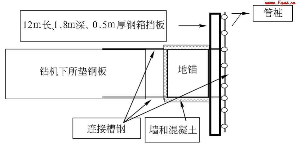 (4)鉆機的錨固對于定向鉆來說非常重要。鉆機在安置期間發(fā)生事故的情況經(jīng)常發(fā)生,甚至和鉆進期間發(fā)生事故的概率相當(dāng),尤其是對地下管線的損壞。在鉆機錨固時,要防止將錨桿打在地下管線上。合理的鉆機錨固是順利完成鉆孔的前提,鉆機的錨固能力反映了鉆機在給進和回拉施工時利用其本身功率的能力。一臺鉆機的推拉力再大,如果鉆機在推拉過程中發(fā)生了移動,其推拉力不但會降低,而且可能會出現(xiàn)孔內(nèi)功率損失,這時會出現(xiàn)鉆機的全部功率作用在鉆機機身上,容易發(fā)生設(shè)備破壞和人員傷害。如果鉆機本身的固定能力差,一方面鉆機的控制能力降低,從而導(dǎo)致無法很好地按預(yù)定的計劃完成鉆進工作;另一方面,鉆機在運轉(zhuǎn)過程中振動較大,會引起鉆桿發(fā)生彎曲或損壞,使鉆孔無法按預(yù)先設(shè)計的軌跡完成。尤其對于大口徑、長距離管道穿越,回拖力大,施工周期長,施工中容易造成地錨失穩(wěn),導(dǎo)致穿越失敗,對此可采取如圖4-1-8所示的方法進行加固。