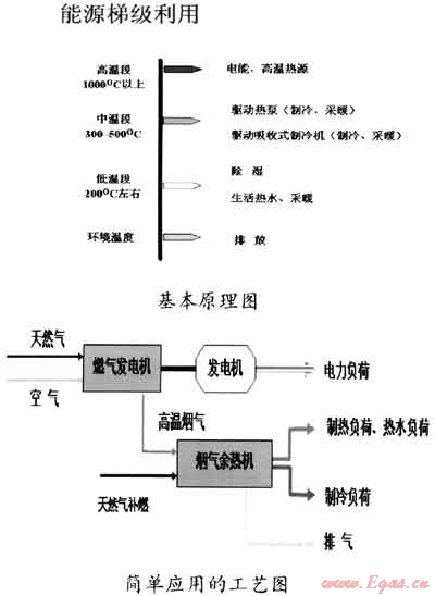 根據(jù)“高能高用、低能低用、溫度對(duì)口、梯度利用”的原理,對(duì)天然氣燃燒產(chǎn)生的高溫?zé)煔?,通過(guò)發(fā)電機(jī)來(lái)提供高品位的電能,對(duì)發(fā)電機(jī)排出的煙氣,根據(jù)用戶的需求,或產(chǎn)生蒸汽、熱水,或轉(zhuǎn)換成冷能,或用于除濕,從而將天然氣所含的能量盡可能地“吃盡榨干”,從而實(shí)現(xiàn)能源的高效利用,同時(shí)也達(dá)到較好的經(jīng)濟(jì)性。