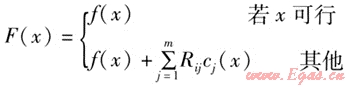 遺傳算法用于求解約束非線性最優(yōu)化問題,最常用的方法是懲罰函數(shù)法,其本質(zhì)是通過懲罰不可行解,把有約束的問題轉(zhuǎn)化為無(wú)約束問題。目前常用的懲罰函數(shù)法有:靜態(tài)懲罰函數(shù)法、動(dòng)態(tài)懲罰函數(shù)法、退火懲罰函數(shù)法等[6],本中采用靜態(tài)懲罰函數(shù)法[7]。這種方法對(duì)每個(gè)約束設(shè)定了三個(gè)違約水平,對(duì)每個(gè)違約水平和每個(gè)約束產(chǎn)生一個(gè)懲罰因子,違約水平越高,懲罰因子Rij(i=1,2,…,L;j=1,2,…,m)越大。Rij確定后,在算法的演化過程中是不變的??紤]了懲罰因子后的新適應(yīng)度F(x)的表達(dá)式為:
