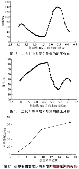 工況1中B層2號(hào)角的動(dòng)壓分布見圖15,在輔助線MN方向上的長(zhǎng)度為5.4m時(shí),動(dòng)壓達(dá)到最大,可以判斷這是燃燒器噴口噴出的射流中心所在的位置。工況1中B層2號(hào)角的靜壓分布見圖16,在輔助線MN方向上的長(zhǎng)度為5.4m的兩側(cè),靜壓分別有兩個(gè)高峰值,這兩個(gè)峰值之差即為燃燒器噴口噴出的射流中心兩側(cè)的靜壓差,約32Pa。通過(guò)此種方法,可以計(jì)算出所有燃燒器射流中心兩側(cè)的靜壓差。各工況燃燒器射流中心兩側(cè)靜壓差平均值見表2,這里的平均靜壓差為各工況下所有燃燒器射流中心兩側(cè)靜壓差的算術(shù)平均值。由表2可知隨著高寬比的增加,燃燒器射流中心兩側(cè)平均靜壓差逐漸增大。