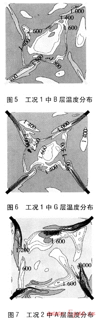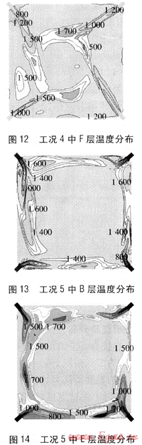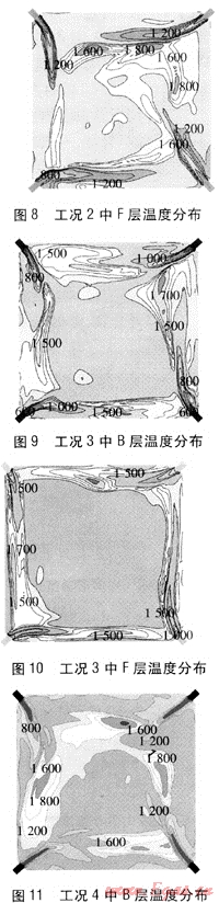 ⑤ 工況5中所有噴口全開,這時(shí)燃燒器的高寬比達(dá)到16.55。計(jì)算結(jié)果顯示,實(shí)際切圓直徑過(guò)大,氣流從燃燒器噴出后直接沖刷爐壁,由圖13、14可知,燃燒器平面的高溫區(qū)域均在壁面附近,這樣會(huì)在爐壁附近形成還原性氣氛,降低了灰熔點(diǎn),運(yùn)行中容易造成爐壁的結(jié)渣。