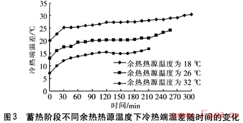 由實(shí)驗(yàn)結(jié)果可知:余熱熱源溫度為18℃時(shí),冷熱端溫差為20.20~30.95℃,制熱性能系數(shù)為1.52~1.14;余熱熱源溫度為26℃時(shí),冷熱端溫差為12.55~23.20℃,制熱性能系數(shù)為1.86~1.51;余熱熱源溫度為32℃時(shí),冷熱端溫差為6.50~17.3℃,制熱性能系數(shù)為2.23~1.71??梢钥闯觯酂釤嵩礈囟仍礁?,冷熱端溫差越小,制熱性能系數(shù)越大。