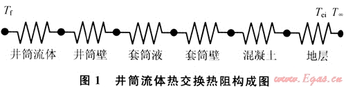 圖1顯示了井筒流體與地層間熱交換最全面的熱阻構(gòu)成??倐鳠嵯禂?shù)U或熱阻R,由6項串聯(lián)組成:①井筒內(nèi)流體的對流換熱;②井筒壁的熱傳導(dǎo);③井筒與套管間環(huán)形空間套筒液的對流換熱;④套筒壁的熱傳導(dǎo);⑤混凝土的熱傳導(dǎo);⑥地層的熱阻。