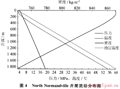 井筒的總傳熱系數(shù)為3W/m2·K,計算的井口壓力是4.19MPa和井底流體溫度55.3℃,與本文參考文獻(xiàn)E6]中所報告的4.38MPa非常吻合。圖4顯示了壓力、溫度和密度的分布。