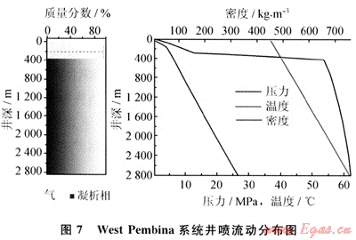 以上述West Pembina系統(tǒng)為例,如果流動處于開口狀態(tài),即井口壓力為101.325kPa,通過GLEWpro分析可知,該井噴流動在井口達(dá)到臨界狀態(tài),其壓力為521kPa、速度為290m/s、流量為23.62×103m3/a,在300m深時流動從液相轉(zhuǎn)變?yōu)闅庀?,如圖7所示。