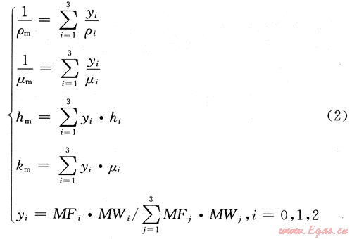 這些流體性質(zhì)計算關(guān)系式適用于氣體(y0=1.0)、液體(y0=0.0)和多相流(0.0<y0<1.0)。下標(biāo)i,j指流體的相態(tài),其中氣相為0,水相為1,凝析相(非水相液體)為2。