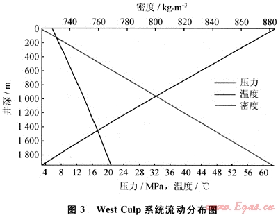 該例計算Anderson West Culp酸氣回注系統(tǒng)井筒底部壓力和井筒流動分布[6]。該井筒為Ø60.325mm管(ID=50.673mm,壁厚4.826mm)垂直1943m深,酸氣組成H2S為60%,CO2為39%,C1為1%。在回注流量為0.6MMSCFD和井口在5.8MPa和3℃的情況下,GLEWpro估計井壓力是21.04MPa,這與本文參考文獻(xiàn)[6]測量的20.2MPa非常接近。圖3顯示了沿井筒的壓力、溫度和密度分布。