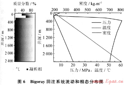 回注井深2396m,井筒為Ø60.325mm管,井底壓力和溫度是20.4MPa和61℃,要注入5℃的7.1×103m3/d的酸氣混合物(9.2%的H2S、89.8%的C02和1%的CH4)。GLEWpro估計的回注壓力是3.91MPa,與本文參考文獻(xiàn)[7]所報告的4.056MPa非常接近。本文參考文獻(xiàn)[7]指出在距井口239.4m左右流體從多相轉(zhuǎn)變?yōu)橥耆合啵珿LEWpro顯示這個轉(zhuǎn)變發(fā)生在250m處,流動和相態(tài)分布見圖6。