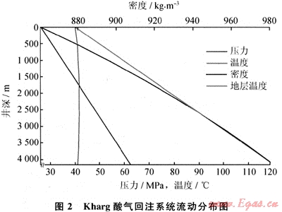 在整個井筒酸氣都處于液相,計算的井口回注壓力為26.39MPa(263.9bar),井底流體的溫度是40.9℃。沿井筒的壓力、溫度和密度分布顯示在圖2。