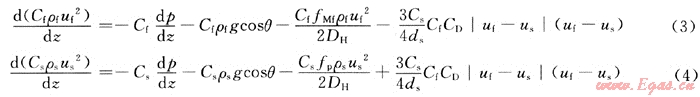 由液固兩相流體力學(xué)[6]可得泡沫和巖屑在環(huán)空中一維穩(wěn)定流動(dòng)的動(dòng)量方程分別為: