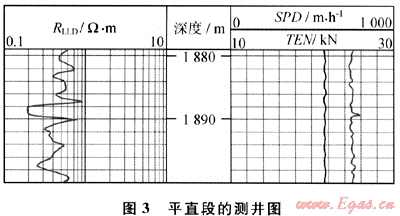 圖3為資料中感應(yīng)電阻率曲線(RILD)及同次測井帶測的張力曲線(TEN)、速度曲線(SPD)。軟件利用曲線擬合法檢查出1888.11~1889.21m為平直段(幅度值均為0.2Ω·m,該段相對均方差為0),同時張力曲線和速度曲線在相應(yīng)的深度段沒有明顯異常,說明并不是因為儀器遇卡現(xiàn)象引起的平直段.因此軟件判斷1888.11~1889.21m為平直異常。