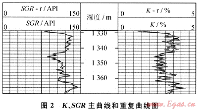 圖2為資料中深度校正后的總自然伽馬(SGR)、鉀含量(K)曲線的主曲線和重復(fù)曲線圖,石油天然氣行業(yè)標(biāo)準(zhǔn)SY/T 5132—2003《測井原始資料質(zhì)量要求》中對自然伽馬能譜測井重復(fù)性的要求為:重復(fù)曲線與主曲線形狀基本相同,總自然伽馬重復(fù)測量值相對誤差應(yīng)小于5%,鉀的重復(fù)測量值相對誤差應(yīng)小于10%。結(jié)合企業(yè)生產(chǎn)實際,約定重復(fù)誤差符合標(biāo)準(zhǔn)的井段總長度不得少于45m(常規(guī)測井重復(fù)曲線至少測50m,50m時90%要符合標(biāo)準(zhǔn),即50×90%=45m)。軟件經(jīng)計算得:曲線SGR重復(fù)曲線與主曲線相關(guān)系數(shù)為0.983,曲線校深后,重復(fù)誤差符合標(biāo)準(zhǔn)的井段總長度為53.5m;曲線K重復(fù)曲線與主曲線相關(guān)系數(shù)為0.765,校深后,重復(fù)誤差符合標(biāo)準(zhǔn)的井段總長度為36.5m。因此,軟件得到重復(fù)性檢查結(jié)論:曲線SGR合格,曲線K不合格。