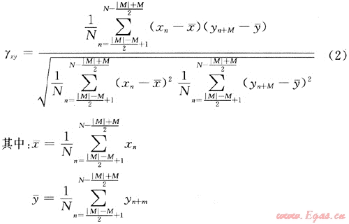 M是Yn相對于Xn的深度差(采樣點數(shù)差),式(2)在M<<N時適用。以M為變量,在適當(dāng)?shù)乃阉鞔伴L內(nèi)變化,則當(dāng)M正好為yn相對于xn的實際深度差時,計算得到的γxy應(yīng)為最大。以此反推,在搜索窗長范圍內(nèi),當(dāng)計算的相關(guān)系數(shù)最大時,M即為yn相對于xn的實際深度差(采樣點數(shù)差)。
