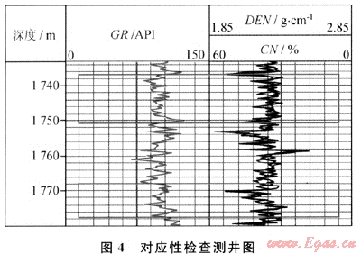 圖4是資料中伽馬曲線(GR)、密度曲線(DEN)、中子曲線(CN)。以GR曲線為基準(zhǔn)曲線劃分層段并挑選層段,1736.81~1750.61m和1768.01~1777.51m(圖中紅框標(biāo)示)是軟件挑選的兩個層段,在兩個層段DEN曲線和CN曲線的相關(guān)系數(shù)分別為-0.75和-0.74,與預(yù)先設(shè)置的規(guī)則(負(fù)相關(guān)、最小相關(guān)系數(shù)0.7,依據(jù)地區(qū)經(jīng)驗設(shè)置)相比,軟件判斷DEN曲線和CN曲線的對應(yīng)性合格。