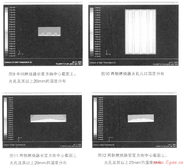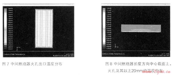 熱態(tài)數(shù)模計(jì)算得到了中間燃燒器和兩側(cè)燃燒器的火孔出口以及火孔以上20mm的溫度分布,見圖7到圖12。由圖中可以看出,無(wú)論是中間燃燒器,還是兩側(cè)燃燒器,火焰都比較均勻,火孔以上有約6mm高度的短火焰,很快燃燒完全,火焰溫度達(dá)到1000℃,與樣機(jī)試驗(yàn)的實(shí)際燃燒溫度相吻合。