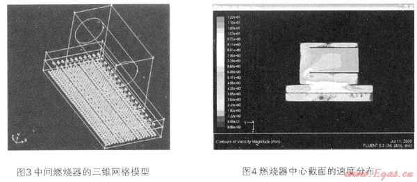 邊界條件包括進(jìn)口處的氣體流量、速度、溫度和組分,并假定經(jīng)過燃燒器頭部的多孔均流板,氣體速度和組分實(shí)現(xiàn)均勻分布。模擬計(jì)算采用的燃?xì)馐?span>12T天然氣,過剩空氣系數(shù)α=1.05,火孔熱強(qiáng)度9.1W/mm2,氣體進(jìn)口溫度為20℃。應(yīng)用Fluent5/6求解器作了數(shù)值計(jì)算。