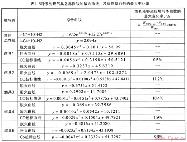 根據(jù)實驗測得的各系列燃具在界限工況時對應(yīng)界限試驗氣的組分?jǐn)?shù)據(jù),計算得到對應(yīng)燃?xì)獾娜紵匦詤?shù),及圖3~8所示的各特性曲線,進(jìn)行回歸分析與曲線擬合,其擬合曲線見表6。