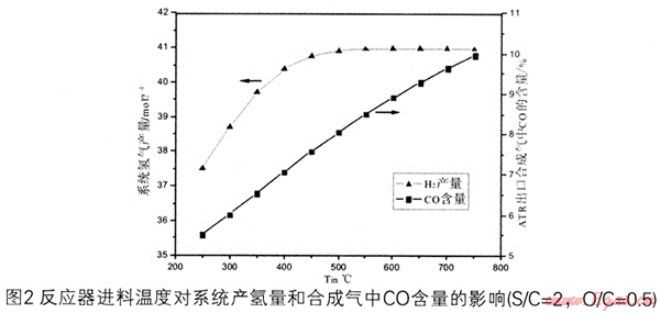 SIC=2,O/C=0.5時,進(jìn)料溫度對氫氣產(chǎn)量及合成氣中CO含量的影響如圖4所示。隨著進(jìn)料溫度Tin的增大,蒸汽重整反應(yīng)的平衡轉(zhuǎn)化率提高,系統(tǒng)產(chǎn)氫量有所增加,但是同時,也產(chǎn)生了更多的CO,這樣就會增加下游合成氣凈化系統(tǒng)的負(fù)荷。當(dāng)Tin<500℃時,隨著Tin的增大,氫氣產(chǎn)量增加的幅度較大,當(dāng)Tin>500℃時,氫氣產(chǎn)量的增加趨勢趨于平緩:ATR出口混合氣中CO的含量與Tin基本呈線性增加。對于整個系統(tǒng)而言,隨著Tin的增大,系統(tǒng)的能耗也將增大(燃燒的天然氣增多)。從圖2可以確定,在所研究的操作條件下,Tin較為合理的范圍是450~500℃。