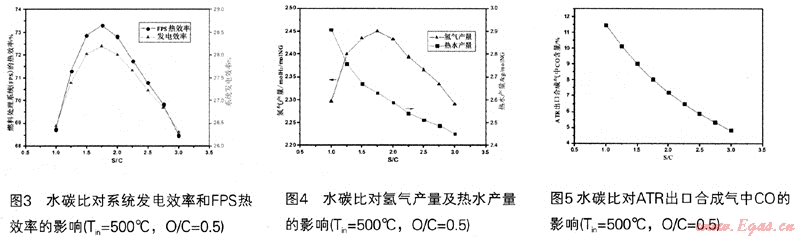 對于整個系統(tǒng)來說,水碳比是重要的操作參數(shù),對系統(tǒng)的效率會產(chǎn)生重要的影響。高水碳比可以防止重整催化劑上積碳的產(chǎn)生,有利于重整反應(yīng)向產(chǎn)物方向進(jìn)行,從而提高氫氣的產(chǎn)率,但是高水碳比會導(dǎo)致整個系統(tǒng)的能耗較大,需要很多額外的能量來產(chǎn)生高溫蒸汽,因而可能會降低燃料處理系統(tǒng)的熱效率。所以要從系統(tǒng)效率的角度去考慮合適的水碳比。圖3-5顯示了自熱重整進(jìn)料溫度為500℃,氧碳比為O.5時,水碳比對發(fā)電效率、燃料處理系統(tǒng)(FPS)熱效率,氫氣產(chǎn)量(molH2/molNG)、系統(tǒng)熱水產(chǎn)量(kg/molNG)DATR出口合成氣中CO含量的影響。