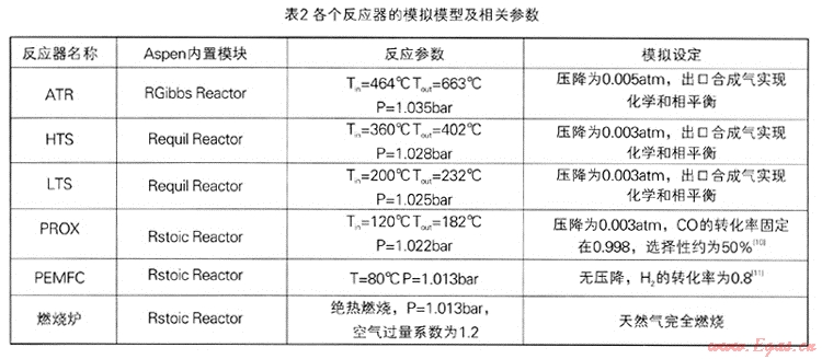 ATR,HTS,LTS和PROX反應(yīng)器在模擬過程中處理為絕熱系統(tǒng),ATR,HTS,LTS反應(yīng)器出口的合成氣處于出口溫度下的化學(xué)平衡狀態(tài),出口溫度由入口物流溫度及絕熱溫升決定。表2列舉了各個反應(yīng)器在模擬過程中Aspen內(nèi)置的模塊及相關(guān)的參數(shù)。