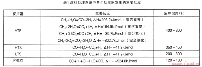 燃料處理系統(tǒng)主要包括天然氣自熱重整制氫反應(yīng)器(ATR),高低溫水汽變換反應(yīng)器(HTS,LTS),CO優(yōu)先氧化反應(yīng)器(PROX),該系統(tǒng)主要為燃料電池提供CO含量低于10ppm的富氫氣體。自熱重整反應(yīng)得到富氫混合氣(30%~38%H2),經(jīng)高溫變換后,混合氣中CO的含量降低到2.0%~4.O%,再經(jīng)過低溫變換使CO的含量降到O.4%~O.9%,最后進(jìn)入PROX,使混合氣中的CO含量降到1Oppm以下,供給到PEM燃料電池。表1中列舉了燃料處理系統(tǒng)中各個反應(yīng)器中發(fā)生的主要反應(yīng)[7]。