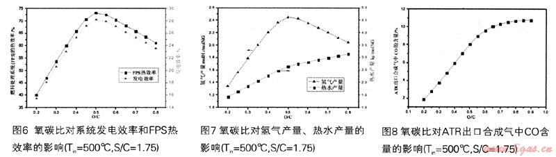 氧碳比也是一個重要的操作參數(shù),圖6-8表示,當(dāng)水碳比為1.75,重整入口溫度為500℃的時候,氧碳比對系統(tǒng)發(fā)電效率、燃料處理系統(tǒng)的熱效率,氫氣產(chǎn)量、熱水產(chǎn)量和ATR合成氣中CO含量的影響。