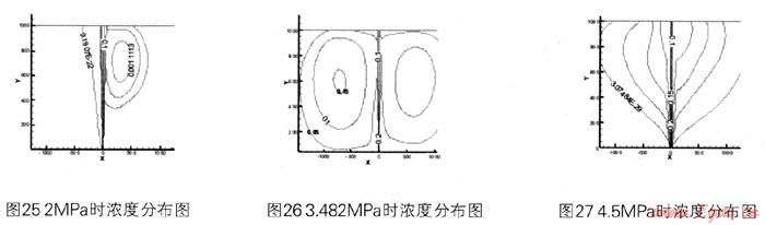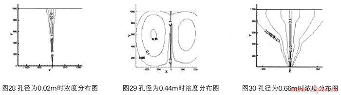 比較圖28、29、90,可以看出當(dāng)泄漏孔徑為0.02m時(shí),由于泄漏孔徑很小,所以濃度等值線比較集中,甲烷和大氣對(duì)流擴(kuò)散比較慢,擴(kuò)散的范圍也比較??;而當(dāng)泄漏孔徑為O.66m時(shí),由于是全截面斷裂,孔徑較大,可以看出等值線變化比較大,擴(kuò)散范圍也大。所以可以看出隨著泄漏孔徑的變大,甲烷可以更好在大氣中擴(kuò)散,危險(xiǎn)區(qū)域會(huì)變大。