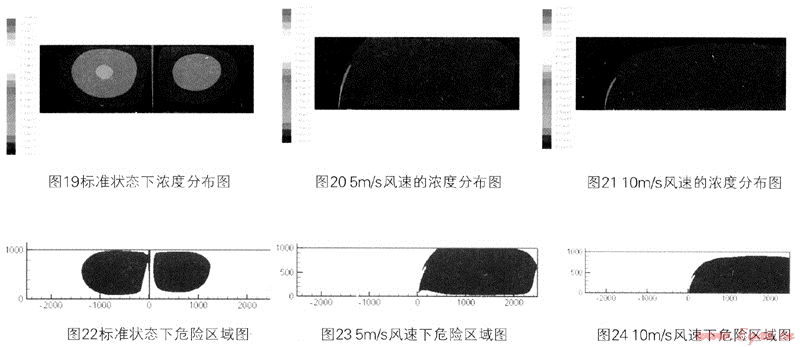 由圖19、20、21可以看出,隨著風(fēng)速的從無到有,從小變大,濃度擴(kuò)散區(qū)域也向右明顯偏轉(zhuǎn),并且擴(kuò)散區(qū)域變大,當(dāng)風(fēng)速為10m/s時(shí),擴(kuò)散區(qū)域已經(jīng)超過了界定的區(qū)域。并且危險(xiǎn)區(qū)域也隨風(fēng)速變大而擴(kuò)大,波及到下風(fēng)向的近地面。