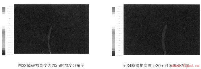 障礙物到泄漏口的距離為5m,障礙物高度為20m和30m 時(shí)的天然氣噴射情況如下圖。