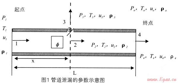計(jì)算參數(shù)如圖1所示,管道起點(diǎn)為1,終點(diǎn)為4,長度為L,在距起點(diǎn)X處存在一點(diǎn),發(fā)生泄漏。圖中:P1,T1,u1,ρ1表示管道起點(diǎn)的運(yùn)行壓力、溫度、氣體速度以及氣體密度;P2,T2,u2,ρ2表示與泄漏孔中心在同一直線上的管道內(nèi)某點(diǎn)的運(yùn)行壓力、溫度、氣體速度以及氣體密度;P3,T3,u3,ρ3表示泄漏點(diǎn)的運(yùn)行壓力、溫度、氣體速度以及氣體密度;P4,T4,u4,ρ4表示這段管道終點(diǎn)處的運(yùn)行壓力、溫度、氣體速度以及氣體密度;Pa,Ta,ua,ρs為管道外大氣的壓力,溫度,風(fēng)速和空氣的密度。